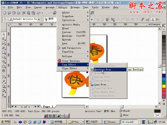 10.選擇Text Tool,打出“新”字,將其放到合適的大小,用Interactive Envelope Tool—PReset List—Envelope 1給它加上圓形封套,再用Interactive Transparency Tool,讓字看起來象寫在燈籠上的。(12)其他幾個字的封套和透明效果可以用Effects—Copy Effect直接從“新”字的屬性復制過來。(13)