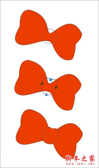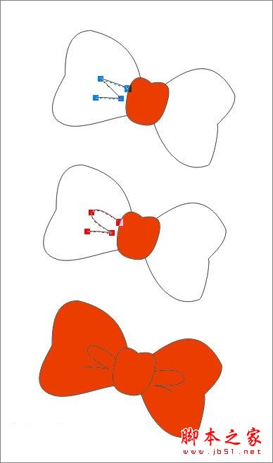 31、蝴蝶結。先用貝塞爾工具畫出直線輪廓,然后用形狀工具選中所有節點,Ctrl+Q轉為曲線后調整平滑,填充紅色,輪廓為黑色。