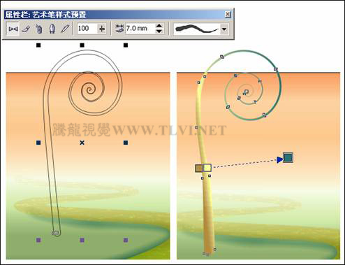 “藝術筆”工具,參照圖10-44左圖所示為曲線添加藝術筆效果。