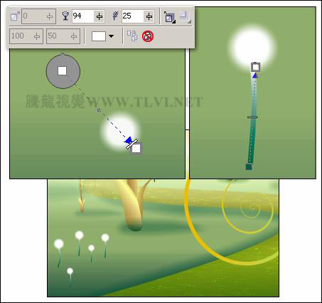 “橢圓”工具,按下<Ctrl>鍵繪制一個正圓,填充為灰色,并為其添加白色陰影效果,然后拆分陰影群組,將原圖形刪除。接著再繪制一條曲線,填充青綠色到白色漸變色,如圖10-46所示制作出一朵小花。