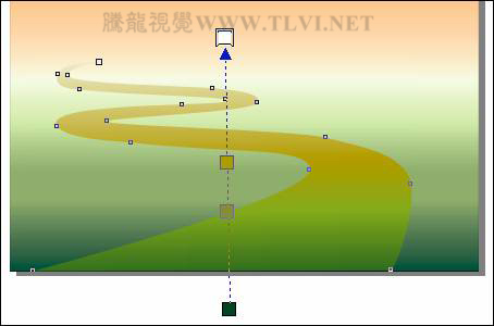 “貝塞爾”工具,參照圖10-38所示繪制小河路徑圖形,并為其填充漸變色,漸變色從下至上依次為深綠色(R9、G66、B22),黃綠色(C42、M32、Y99、K2),芥子色(C0、M10、Y100、K30),白色。