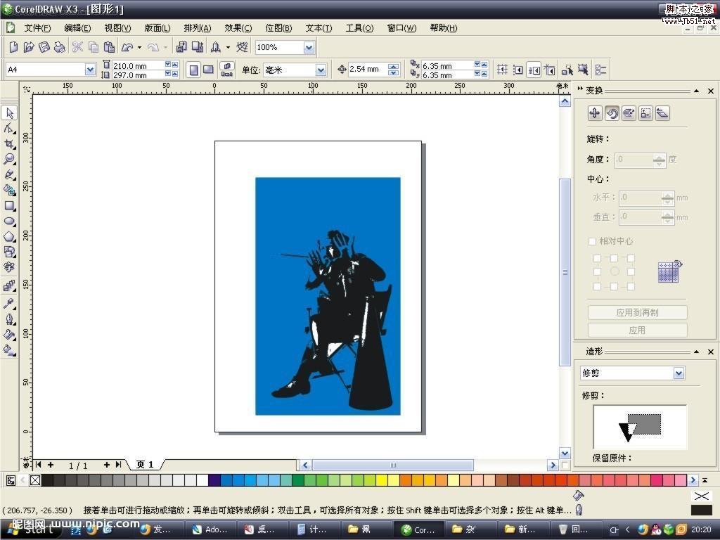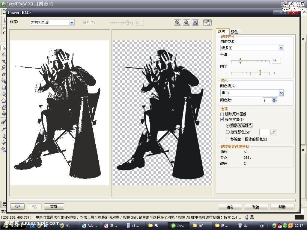 原圖最終在CD里打開圖片. 在菜單欄里:"位圖"-->轉換為位圖(參圖如下)第二步, :"位圖"-->"描摹位圖"-->"線條圖"得出圖片的矢量圖,解除群組,然后,我們在圖層后,加一個藍色背景,