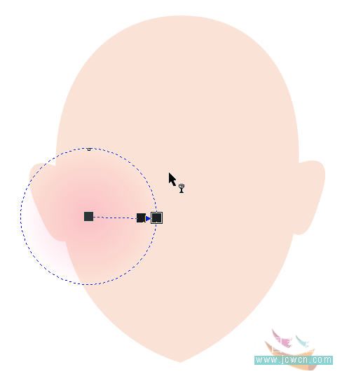 3、將添加透明后的圓形復制一個到臉的另外一邊,然后選擇這兩個圓形,按住右鍵拖曳鼠標至臉部后松開鼠標,在隨后彈出的菜單命令中選擇“精確裁剪至內部”,將腮紅置于臉部內合適的位置,效果如下圖所示: