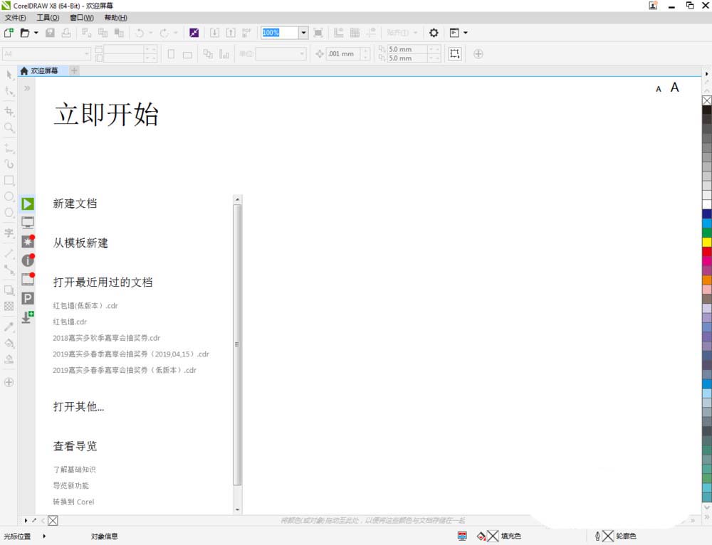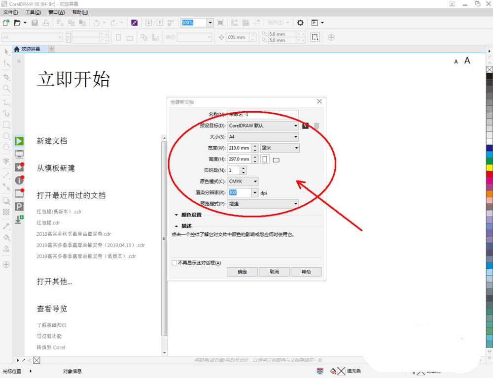 1、打開CorelDRAW X8 軟件,點擊【新建文檔】,按圖示參數新建一個cdr文檔(如圖所示);