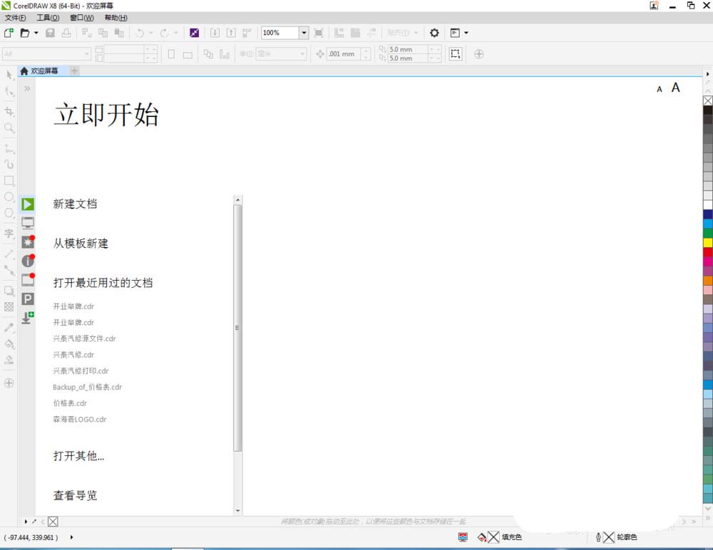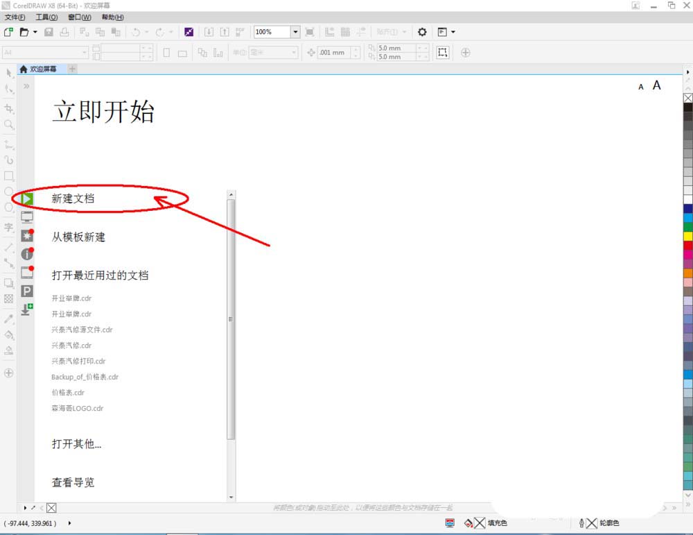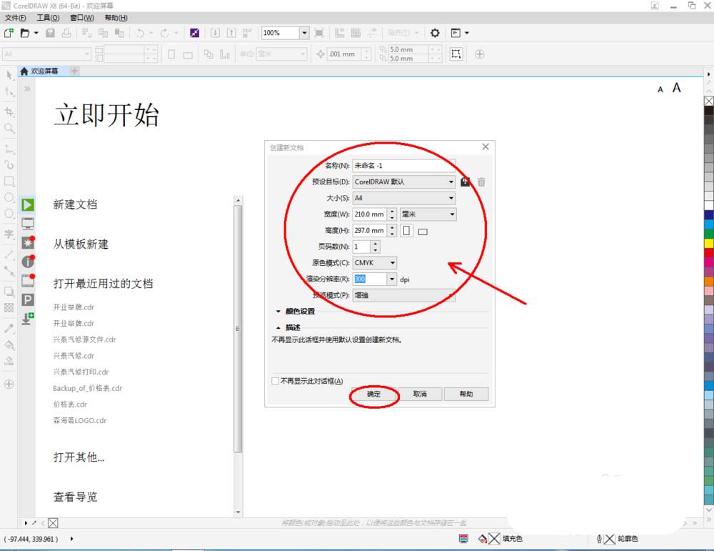 1、打開CorelDRAW X8軟件,點擊【新建文檔】,按圖示參數設置新建一個cdr文檔(如圖所示);