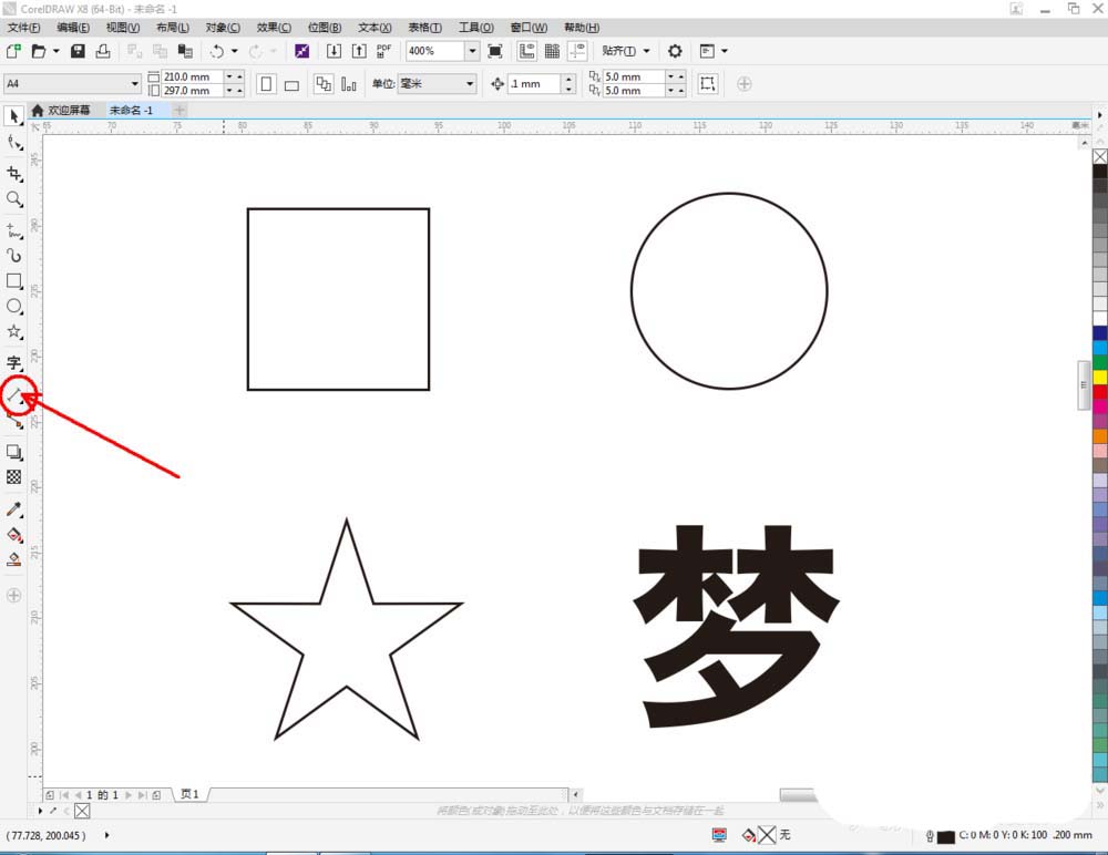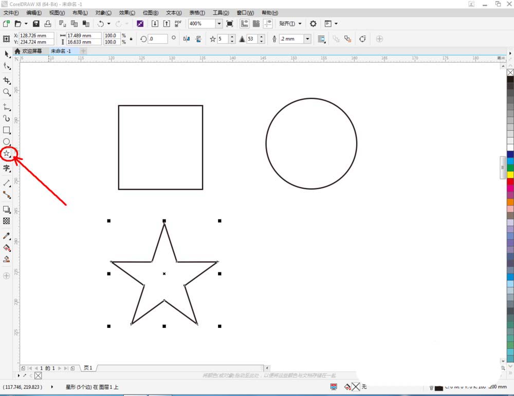 2、點擊【矩形工具】,在作圖區域繪制一個矩形圖案;點擊【橢圓形工具】,在作圖區域繪制一個圓形圖案;點擊【星形工具】在作圖區域繪制一個星型圖案;點擊【文本工具】,繪制一個文字圖案(如圖所示);