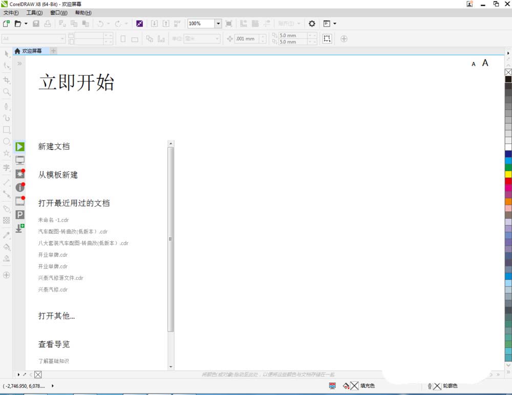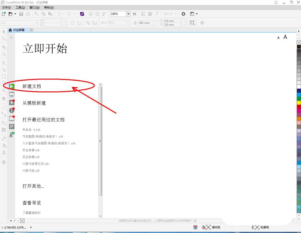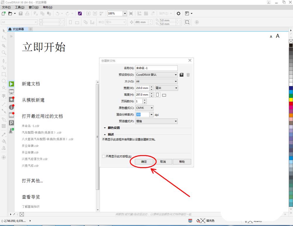 1、打開CorelDRAW X8軟件,點擊【新建文檔】,按圖示參數(shù)新建一個cdr文檔(如圖所示);