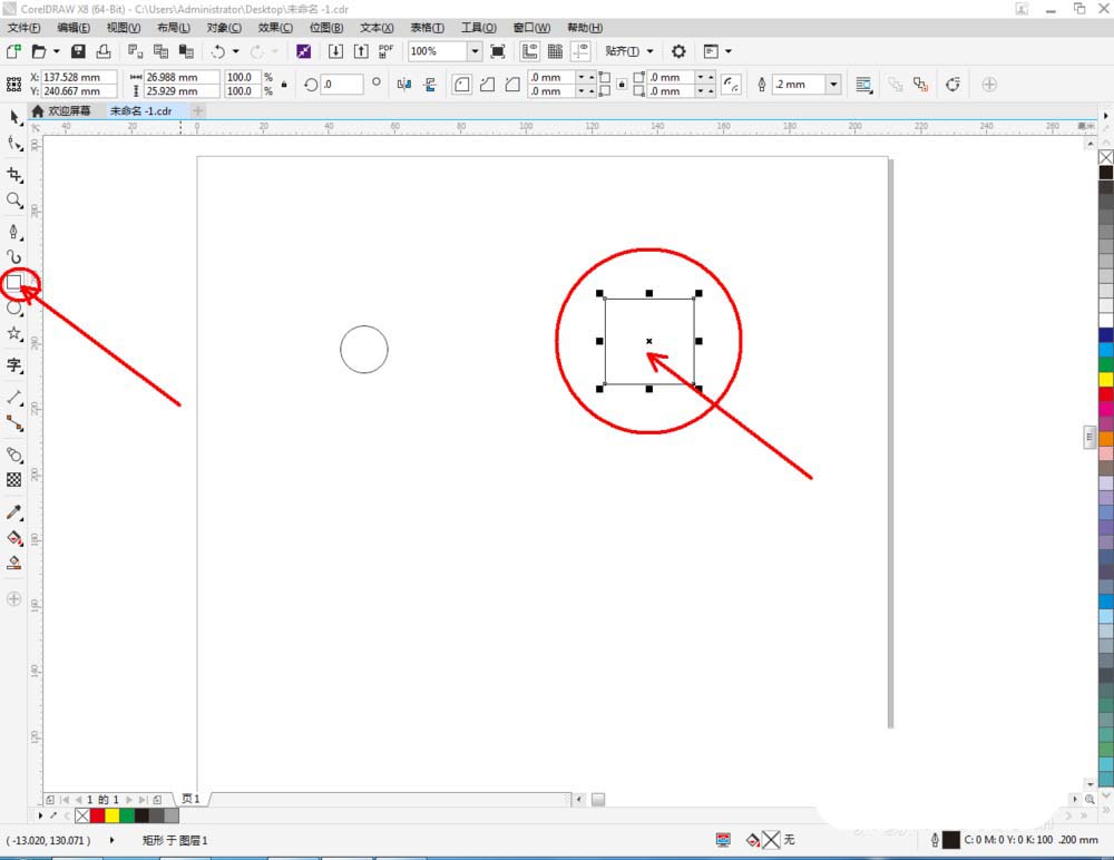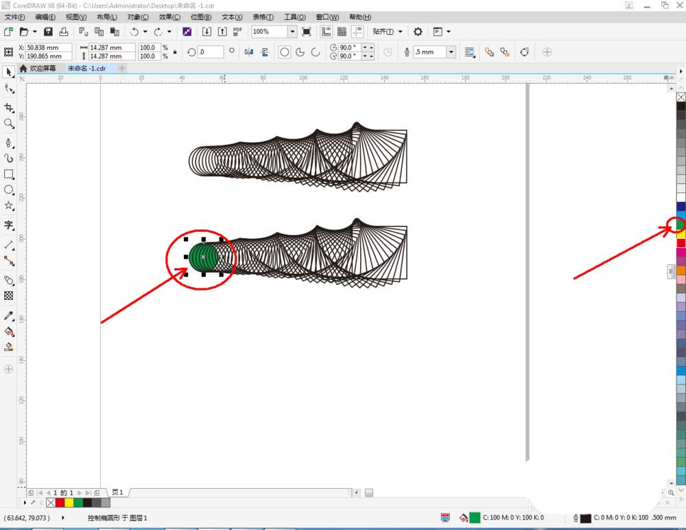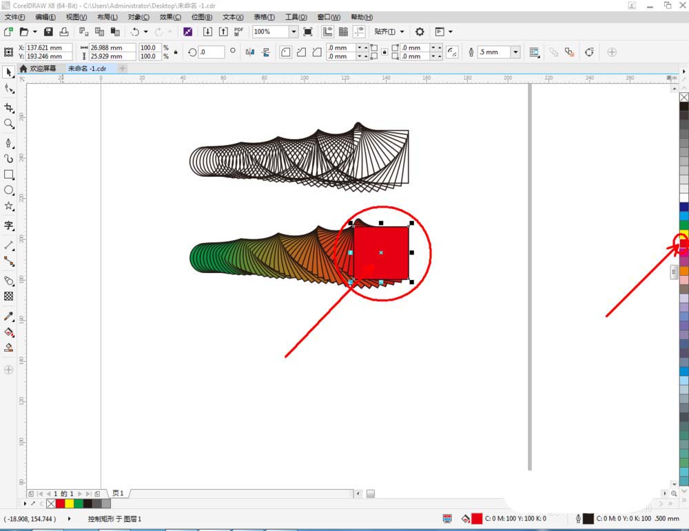 3、選中做好的圖形,鼠標右鍵拉動復制出另一個圖形。框選圓形圖案,鼠標左鍵點擊右邊色板中的綠色色塊進行填充;完成后框選矩形圖案,鼠標左鍵點擊色板中的紅色進行填充(點擊上方【順時針調和】和【逆時針調和】可進行顏色調整);