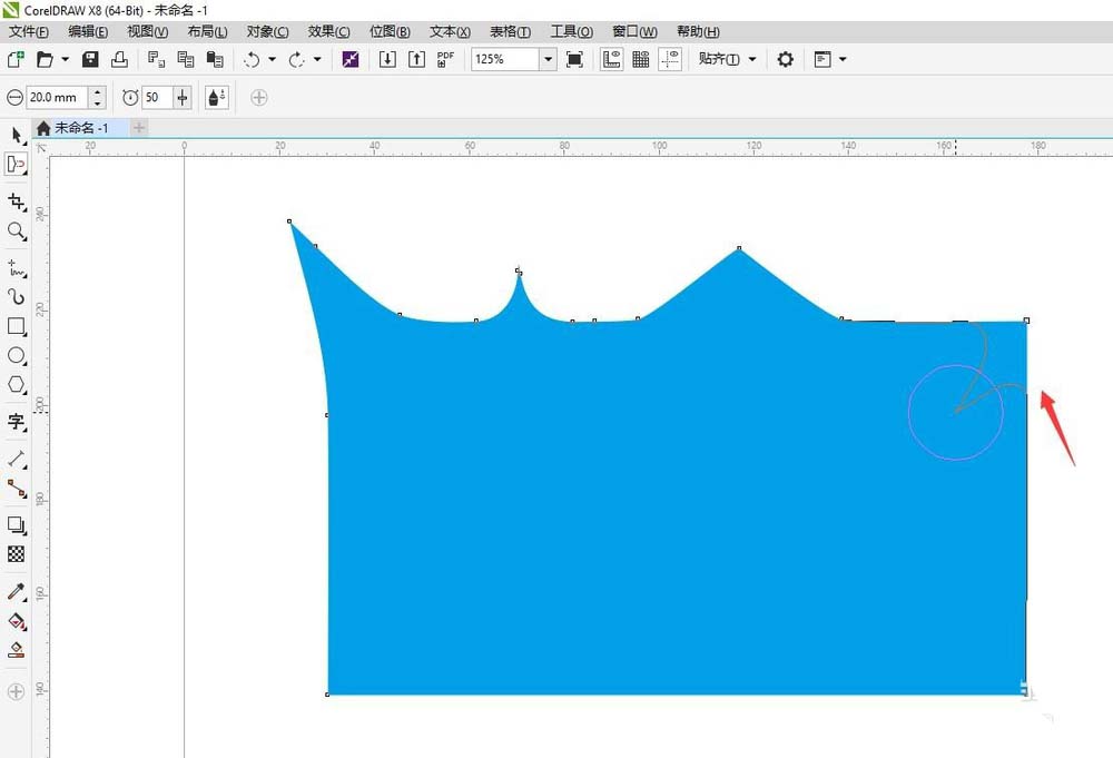 2、選中圖形點(diǎn)擊邊緣向外拉動(dòng),可以看到選中的地方拉出一個(gè)形狀,吸引工具就是通過(guò)將節(jié)點(diǎn)吸引到光標(biāo)處來(lái)調(diào)整對(duì)象形狀。
