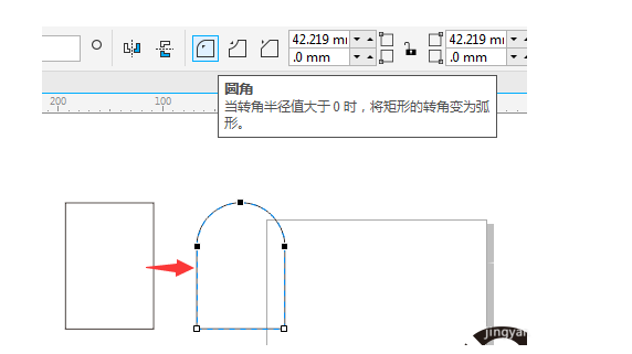 1、打開cdr軟件,先畫出一個矩形,形狀工具選擇矩形上面兩個節點,給一個最大的圓角半徑值。