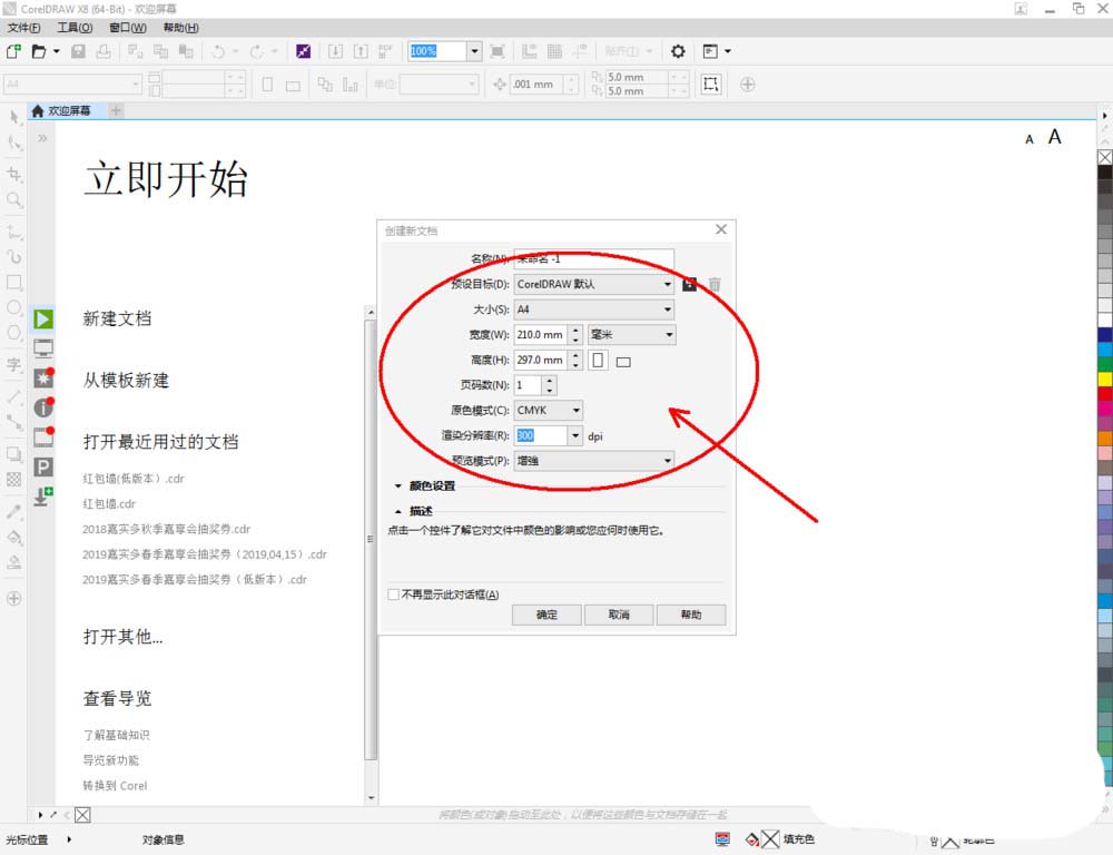 1、打開CorelDRAW X8軟件,點擊【新建文檔】,按圖示參數新建一個cdr文檔(如圖所示);