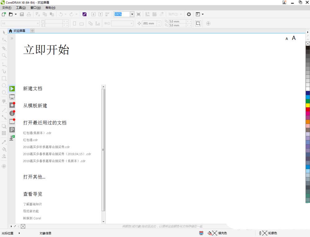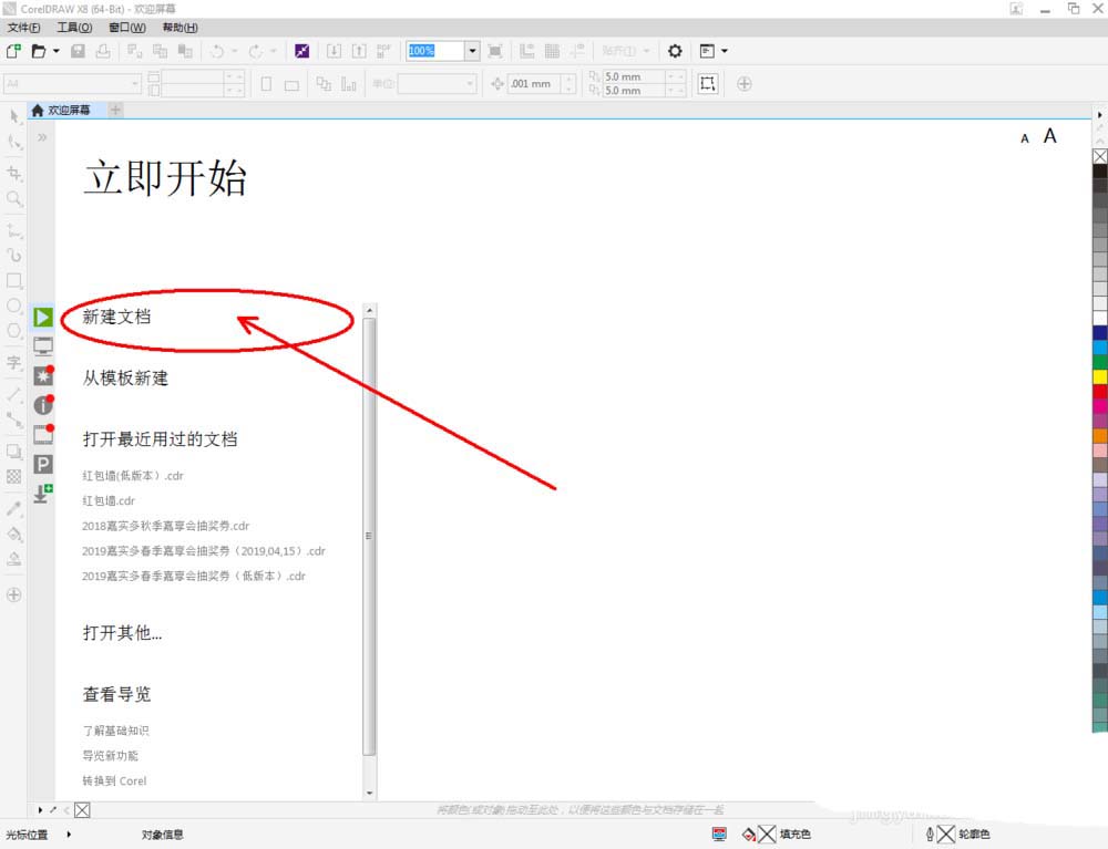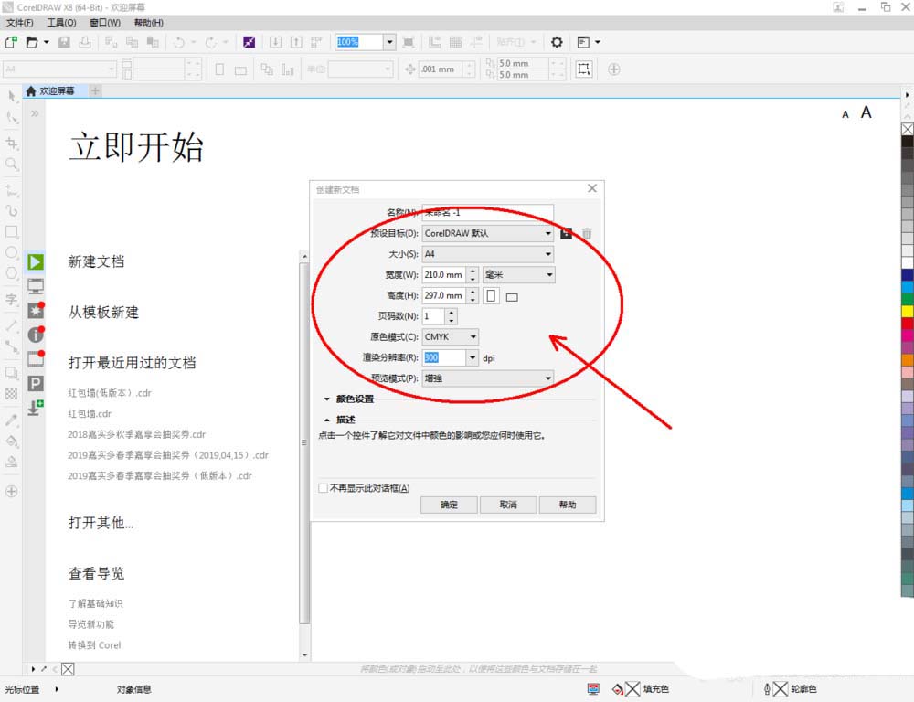 1、打開CorelDRAW X8 軟件,點擊【新建文檔】,按圖示參數新建一個cdr文檔(如圖所示);
