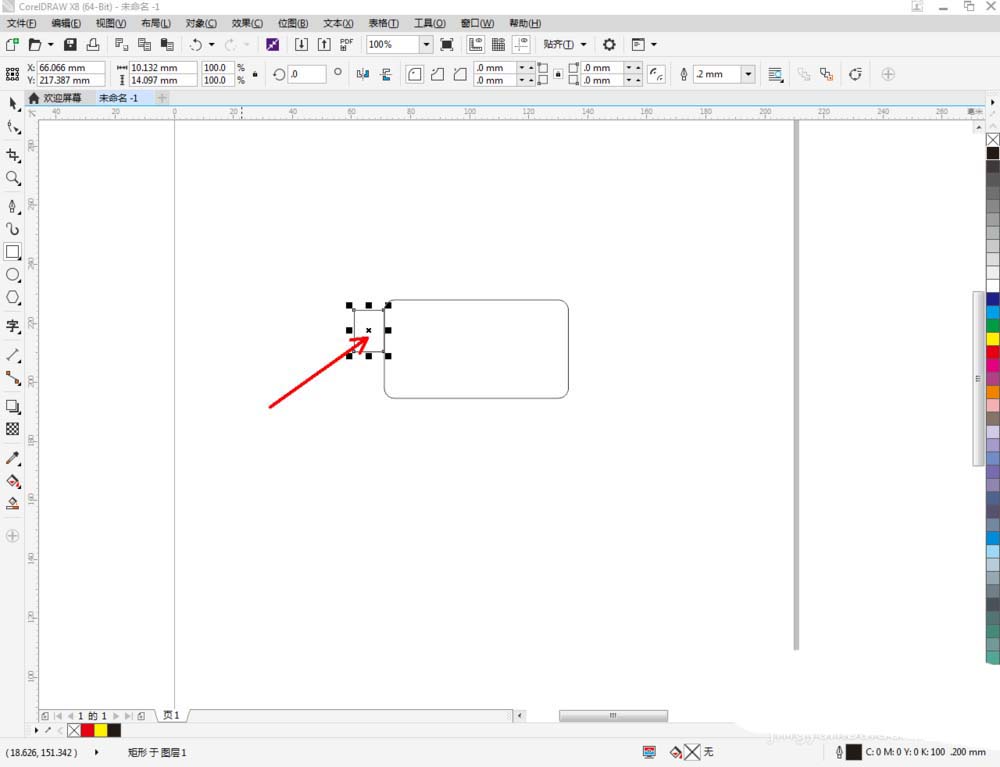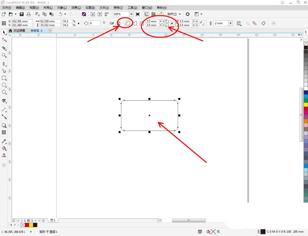 2、點擊【矩形工具】,按圖示設置好圓角的參數后,在作圖區域繪制一個圓角矩形圖案。完成后,按圖示繪制出另外三個直角矩形圖案(如圖所示);