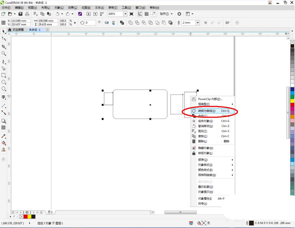 3、選中三個直角矩形圖案,點擊鼠標右鍵-【轉化為曲線】將矩形轉曲后,點擊【變形工具】,按圖示對圖案上的節點進行位置調整(如圖所示);