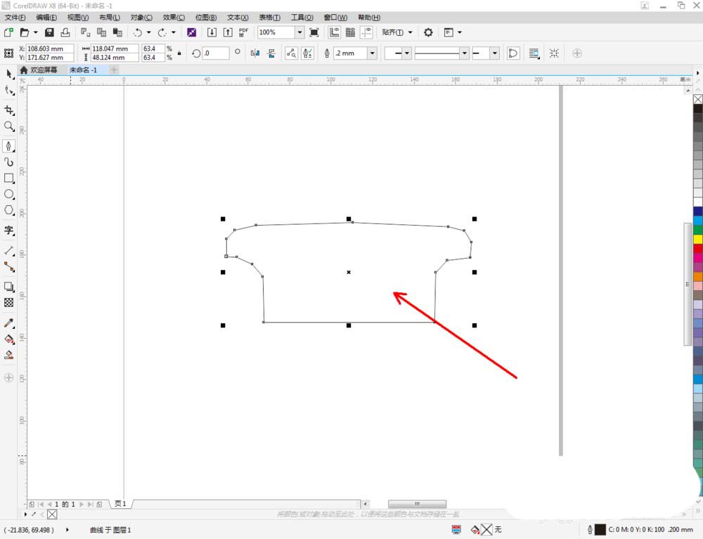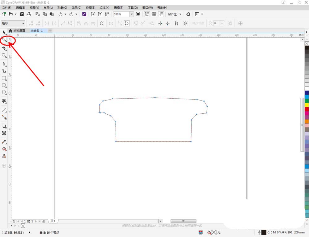 2、點擊【鋼筆工具】按圖示在作圖區域繪制出一個多邊圖案。點擊【形狀工具】,框選所有的節點后,點擊【轉化為曲線】將節點轉曲。完成后,選中圖示圖案上的節點,點擊【平滑節點】將節點進行平滑處理并調整好控制點(如圖所示);