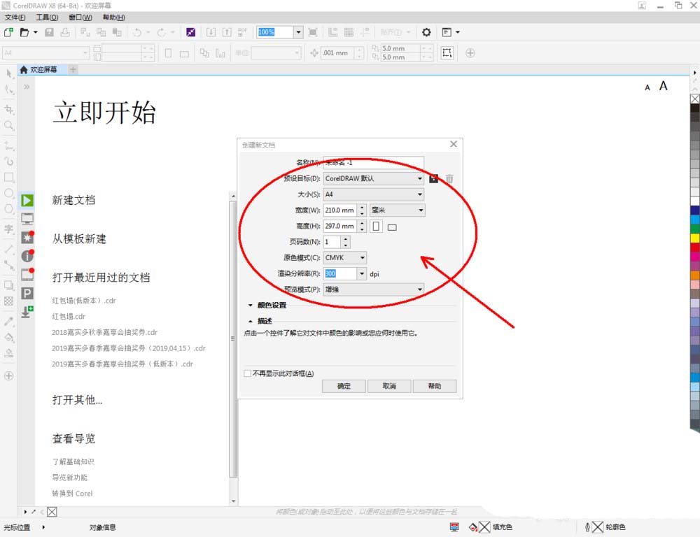 1、打開CorelDRAW X8 軟件,點擊【新建文檔】,按圖示參數新建一個cdr文檔(如圖所示);