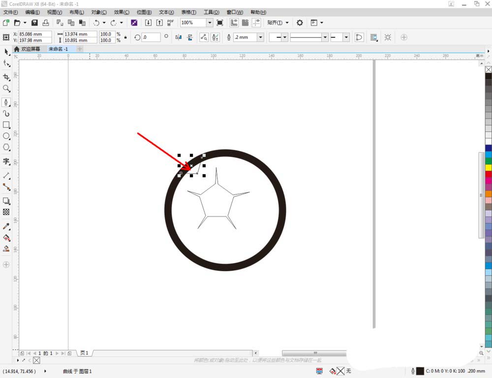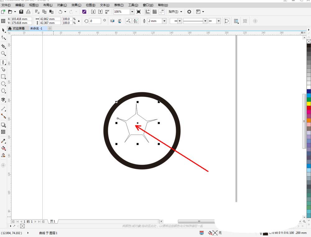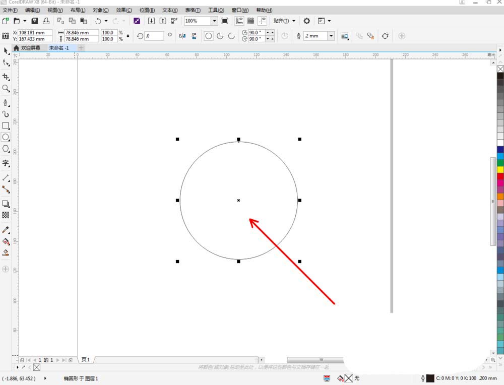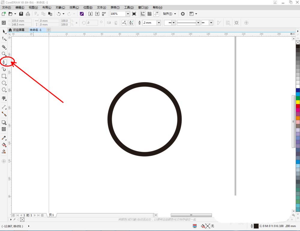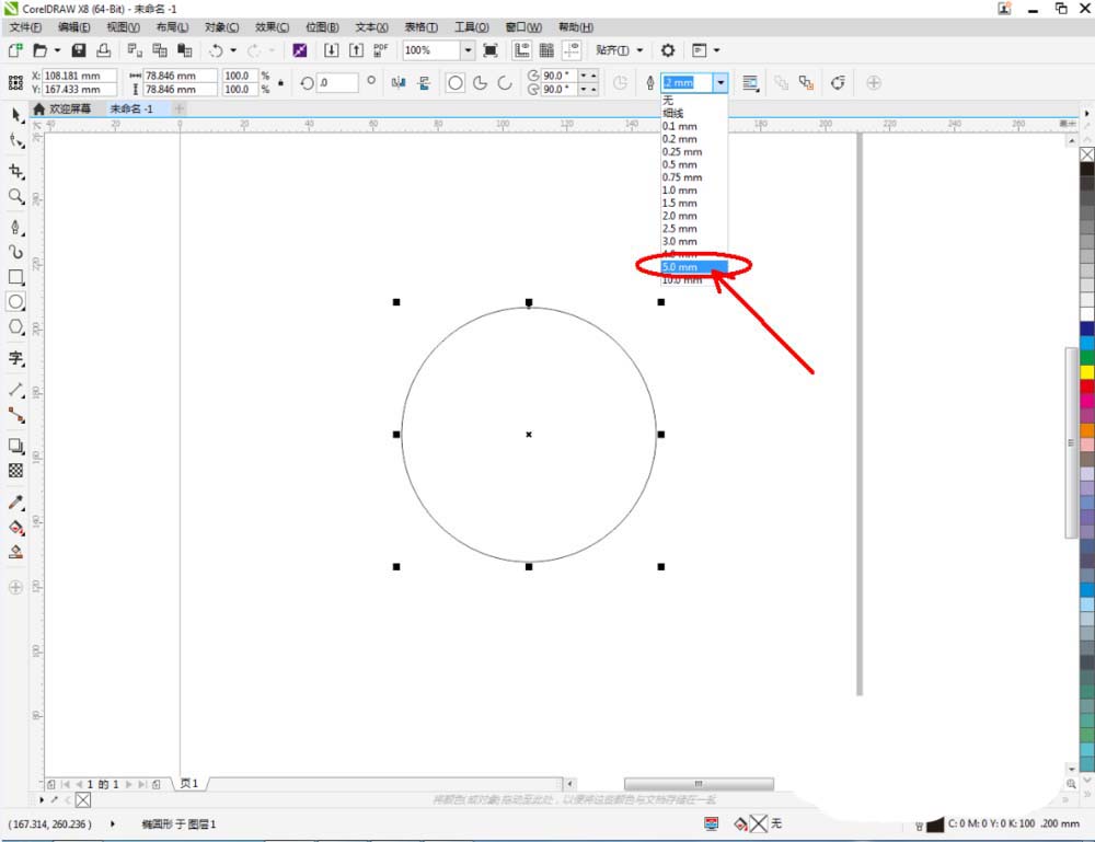 2、點擊【橢圓形工具】在作圖區域繪制一個圓形圖案后,點擊【輪廓寬度】將圓形圖案的輪廓寬度設置為:5mm(如圖所示);