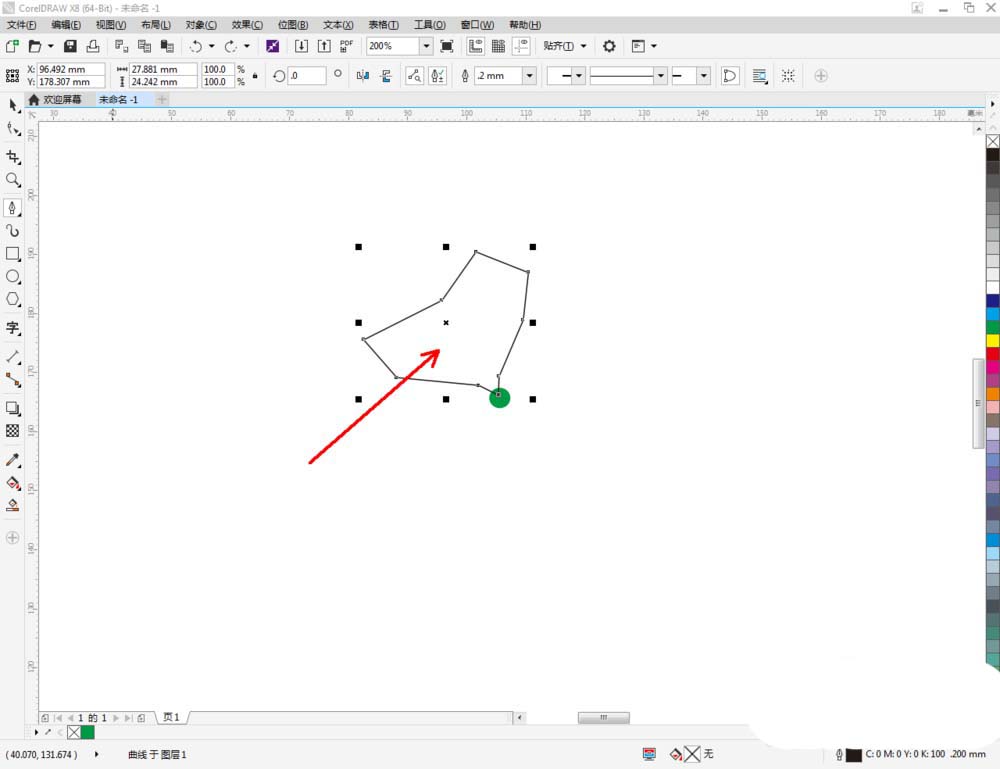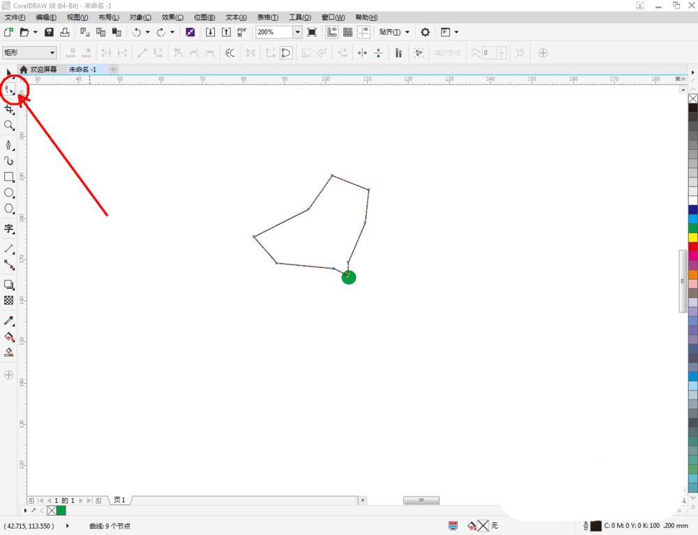 3、點擊【鋼筆工具】在圖示區域繪制一個多邊圖案后,點擊【形狀工具】,框選圖案上的節點,點擊【轉化為曲線】將節點轉曲。完成后,選中圖示圖案上的節點,點擊【平滑節點】將節點進行平滑處理并調整好控制點(如圖所示);
