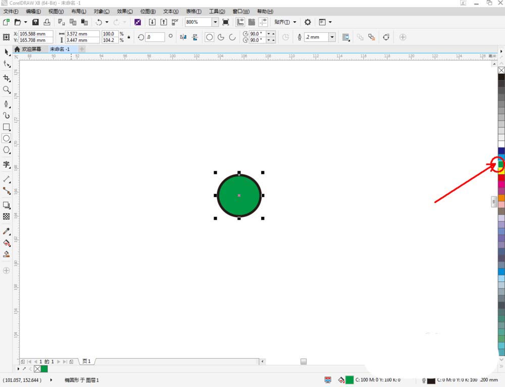 2、點擊【橢圓形工具】在作圖區域繪制一個圓形圖案后,鼠標左鍵點擊右邊色板中的綠色色塊,將圖案填充為綠色;鼠標右邊點擊右邊色板中的×,去除圖案描邊(如圖所示);