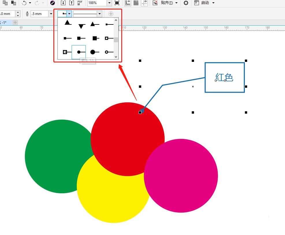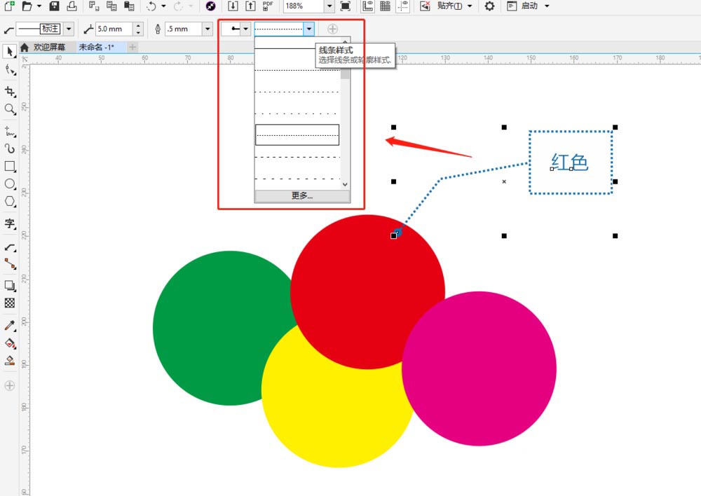 5、標注箭頭和線條樣式:在屬性欄中可以選擇各種剪頭樣式和線條樣式。不同樣式效果不同。如下圖所示。