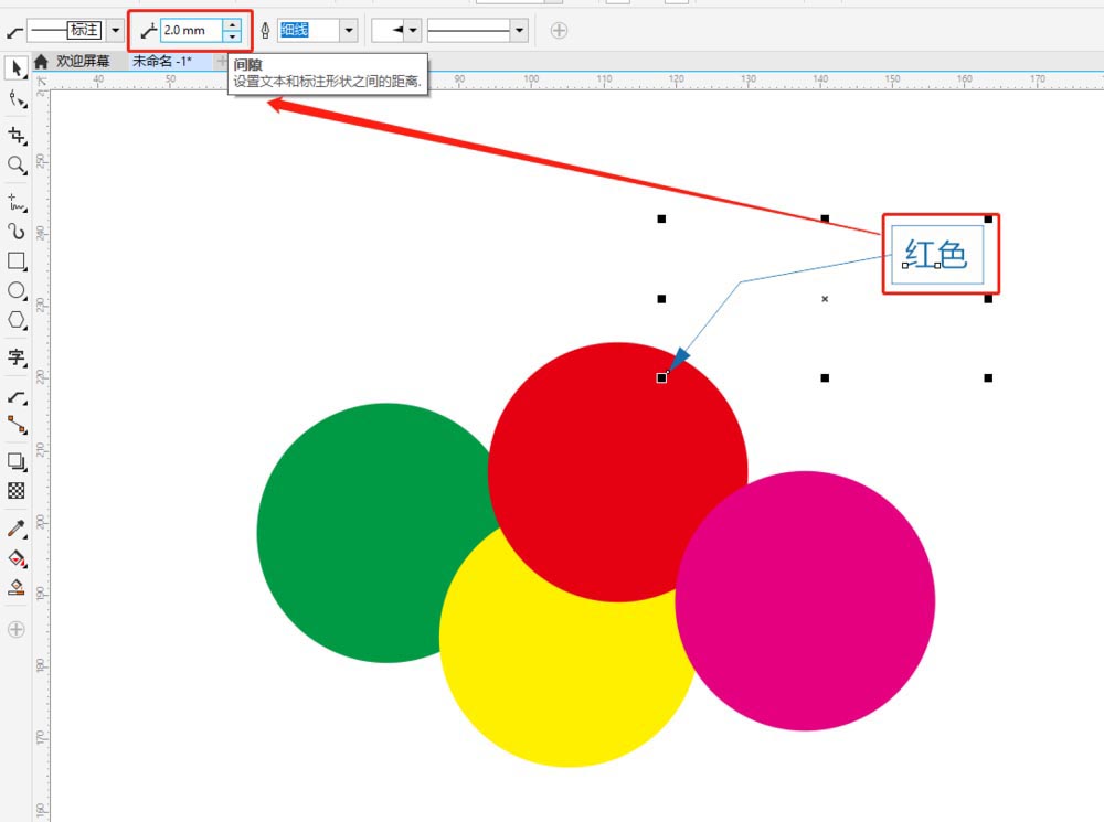 4、間隙:點擊屬性欄間隙可以調整文本和標注形狀之間的距離。如下圖,距離為2mm和5mm時效果。