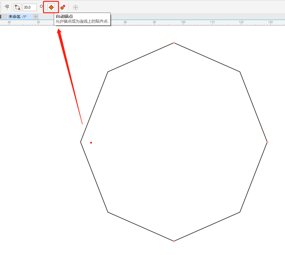 4、點擊屬性欄上的【自動錨點】允許錨點成為連線上的貼齊點,一般是默認激活的,也就是紅色錨點,當自動錨點關閉時,錨點變為藍色。