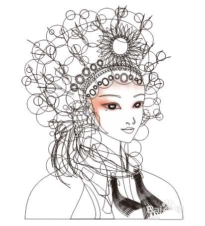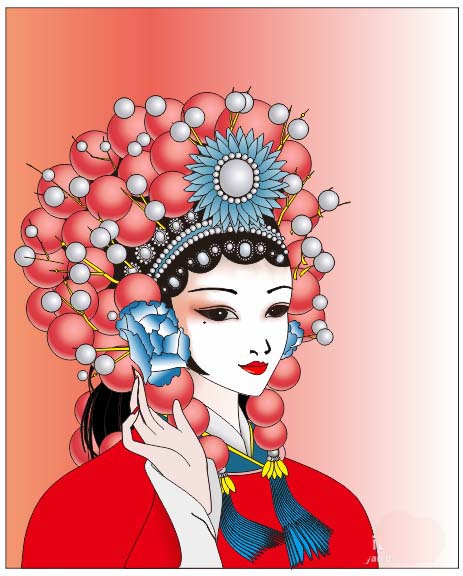 2、填充顏色,臉的部分可以選擇使用網(wǎng)狀填充工具,整體的明暗要劃分好,暗面可以也用漸變填充和陰影工具來表現(xiàn),發(fā)冠上的珠子和裝飾建議先做出一個來,然后復(fù)制、調(diào)整,這樣可以很快速的完成這繁瑣的頭飾。