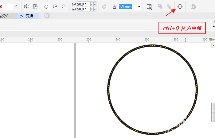 2、選中畫的圓,我們點擊"轉為曲線"(快捷鍵是ctrl+q),如圖所示;