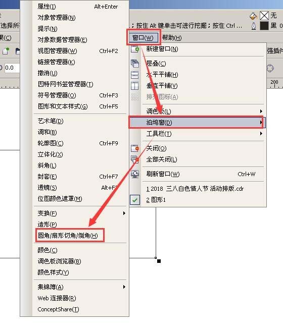 3、選擇菜單欄窗口→泊塢窗→圓角/扇形切角/倒角