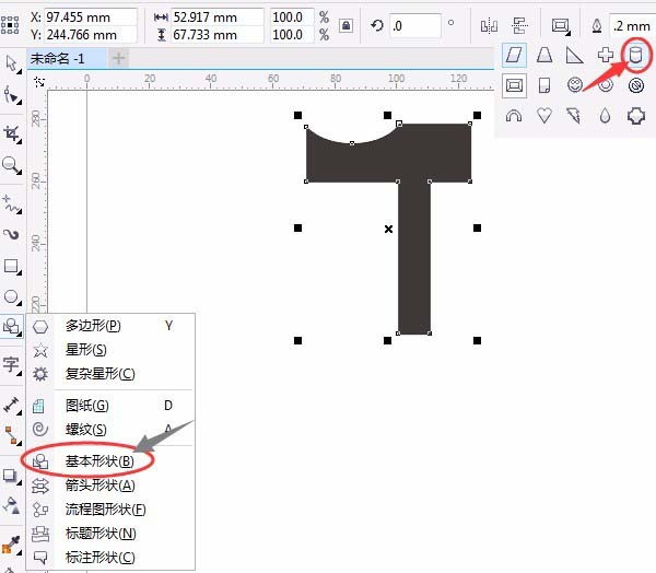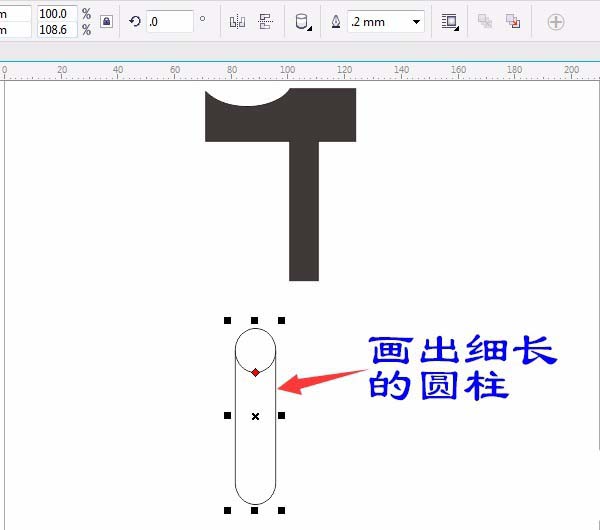 6、單擊選“基本形狀”,屬性欄中選圓柱基本形狀,畫出細長的圓柱,如圖: