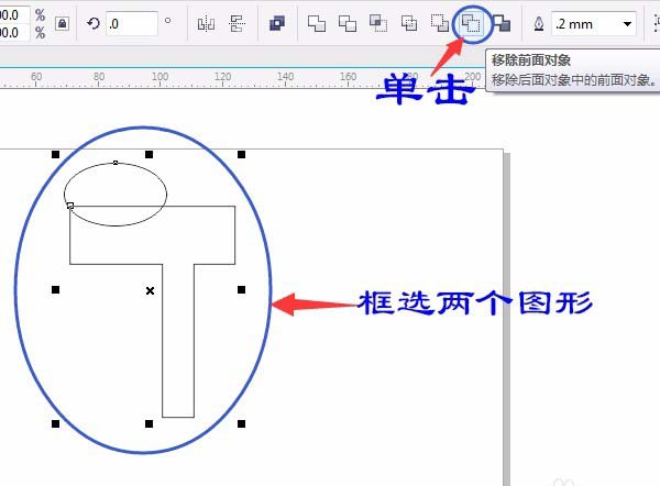 4、按空格鍵切換成“選擇工具”框選兩個圖形,單擊屬性欄中“移除前面對象”,如圖所示: