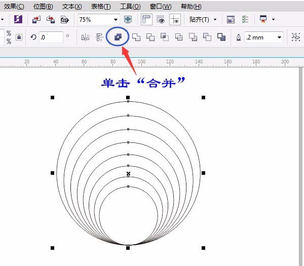 5、用“選擇工具”(按空格鍵即可切換為選擇工具)框選所有圖形,單擊屬性欄中單擊“合并”,如圖所示: