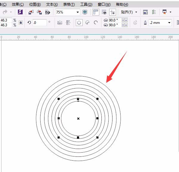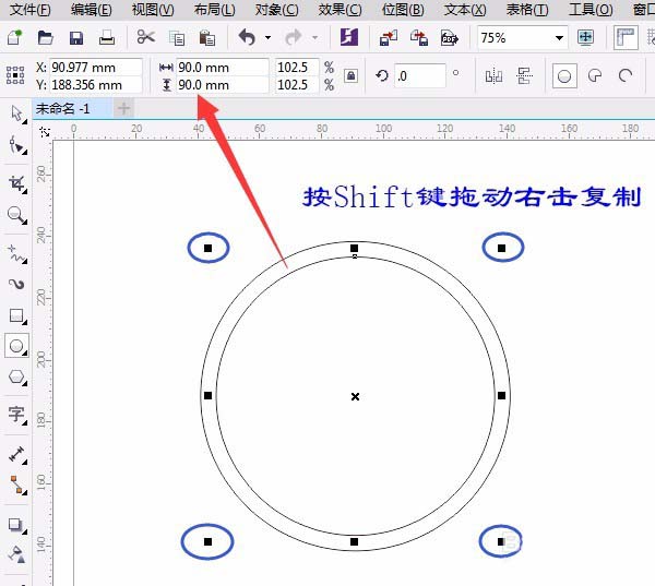 2、復制正圓:四個角的小方框任一個按Shift鍵往里拖動變小右擊復制,并在“屬性欄”中改為90,如圖所示: