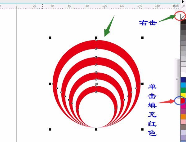 6、單擊“調色板”填充紅色,外部線條為無,右擊調色板最上面的工具×,結果如圖: