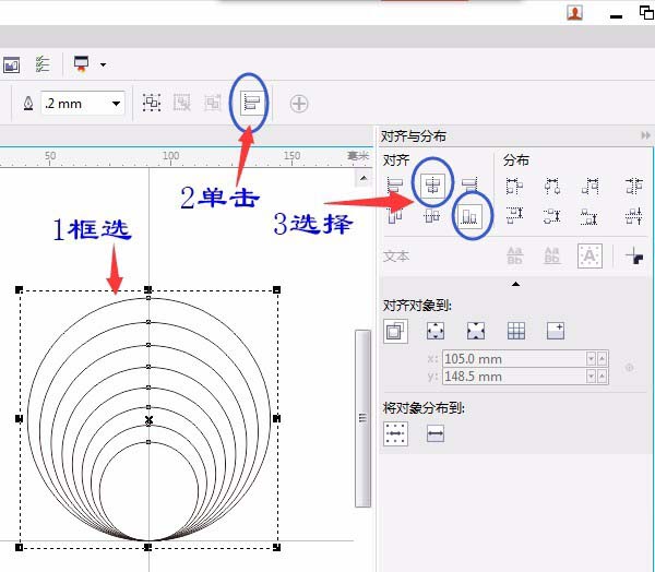 4、用“選擇工具”(按空格鍵即可切換為選擇工具)框選所有圖形,單擊選擇屬性欄中的“對齊與分布”:選“水平居中對齊”和“底部對齊”或單擊“對象”菜單→對齊和分布→選對齊方式。如圖: