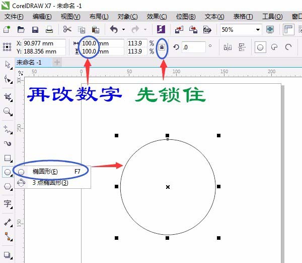 1、單擊用“橢圓形工具”按Ctrl鍵畫一個正圓,并在“屬性欄”中改為(對準數字雙擊只改數字即可)100,如圖所示: