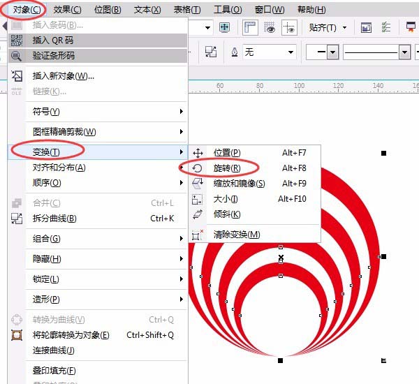 7、按空格鍵切換為“選擇工具”框選所有圖形對象,單擊“對象”菜單→變換→旋轉(Alt+F8),對話框如圖設置,單擊應用,如圖所示: