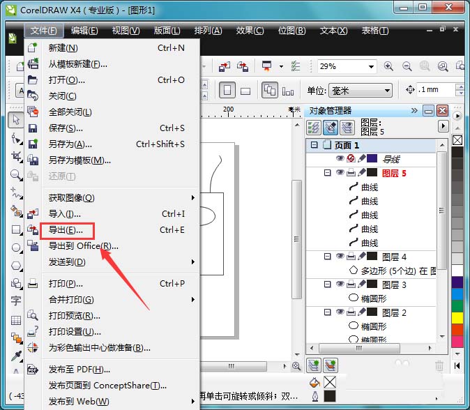 6、繪制好圖形以后再在菜單里找到文件選項(xiàng),點(diǎn)擊該選項(xiàng)在其下拉菜單里找到導(dǎo)出選項(xiàng),如圖所示: