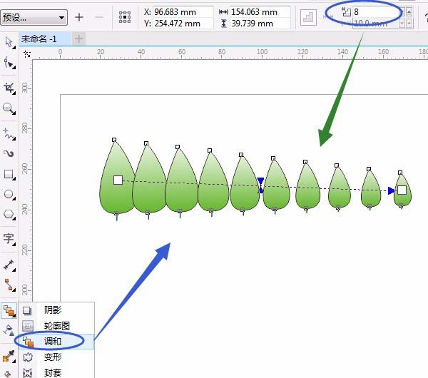 3、按空格鍵后移動右擊復制一個后變小,用“調和工具”進行調和,屬性欄中輸入數字如8左右,根據需要增加或減少數字,如圖: