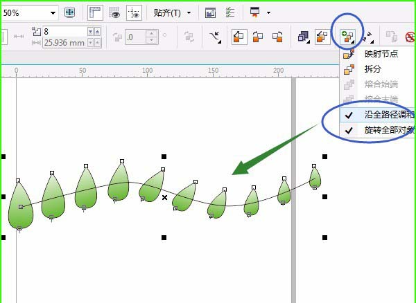 8、用同樣的方法調和、屬性欄中選“新路徑”鼠標形狀變彎曲箭頭時單擊路徑,移動樹葉位置、旋轉等操作。結果如圖:
