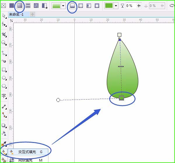 2、單擊用“交互式填充”工具,屬性欄中選“漸變填充”中的“線性漸變”,顏色改為綠色進行漸變,再畫一線段和變顏色,按快捷鍵Ctrl+G組合兩對象,如圖: