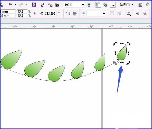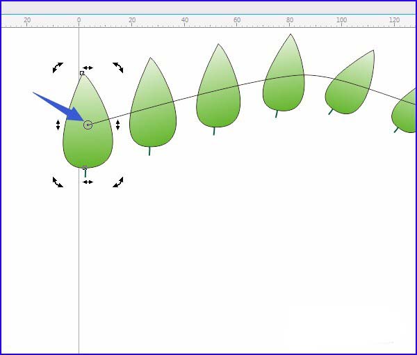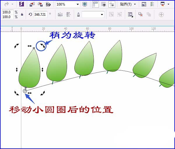 6、先在樹葉以外單擊鼠標,再單擊兩次第一個樹葉,對準小圓圈處按住鼠標往下移動,旋轉,右邊的最后一個樹葉一樣操作方法,如圖: