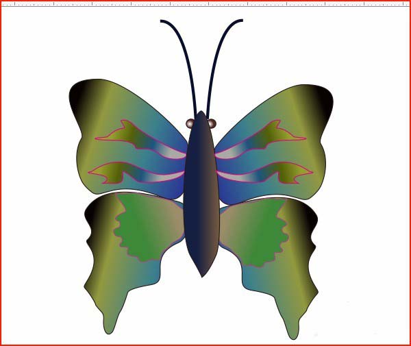 1、用“貝塞爾工具”、“橢圓形工具”畫出蝴蝶中間部分,可拉出輔助線,用“形狀工具”調整,并用“交互式填充工具”漸變效果,如圖所示: