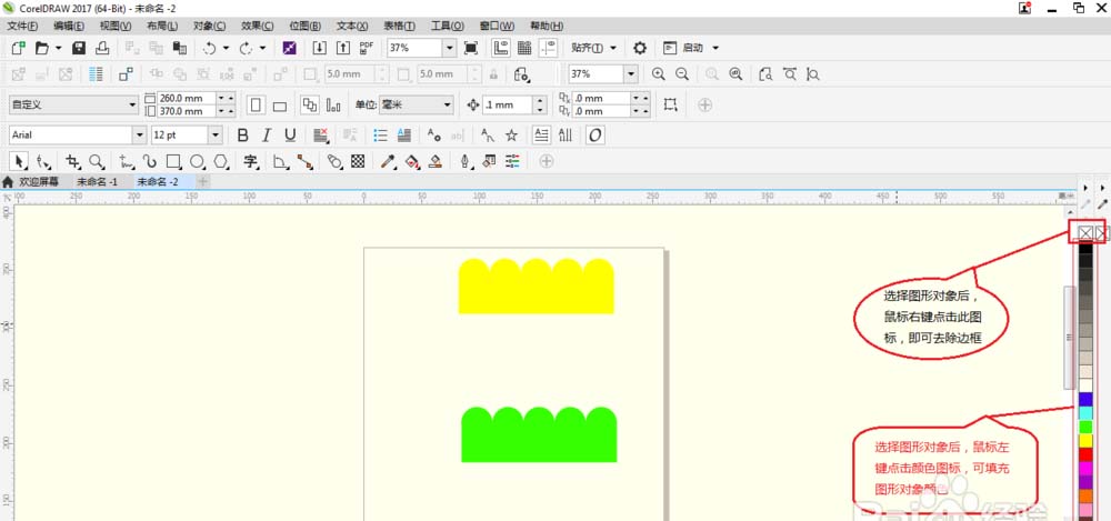 4、給圖形填充顏色(鼠標(biāo)左鍵填充顏色,鼠標(biāo)右鍵去除輪廓),得到下圖1的圖案,復(fù)制(快捷鍵:ctrl+D)一個(gè)圖形出來,垂直往下移動(dòng)(按住shift鍵垂直移動(dòng)),填充另一個(gè)顏色。如下圖2所示: