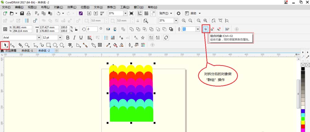 6、調(diào)和出合適的圖案后,打開菜單欄中的“對象”選擇“拆分調(diào)和群組”功能,再對所有圖形進(jìn)行“對象群組”,如下圖2: