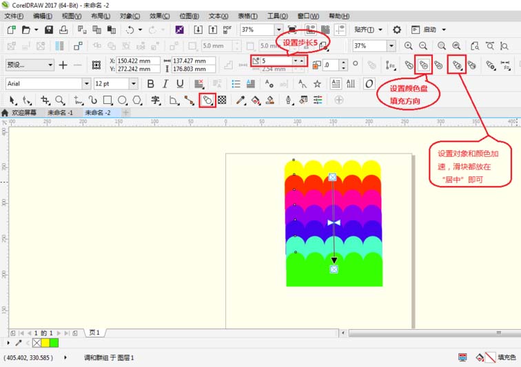 5、使用“調(diào)和工具”,調(diào)和工具如下圖1,拖拽出多個(gè)圖案,并設(shè)置調(diào)和工具相應(yīng)屬性,設(shè)置調(diào)和對象步數(shù)(6),調(diào)和方向,顏色對象加速等屬性,按照個(gè)人要求進(jìn)行設(shè)置,可參照下圖2參數(shù)設(shè)置: