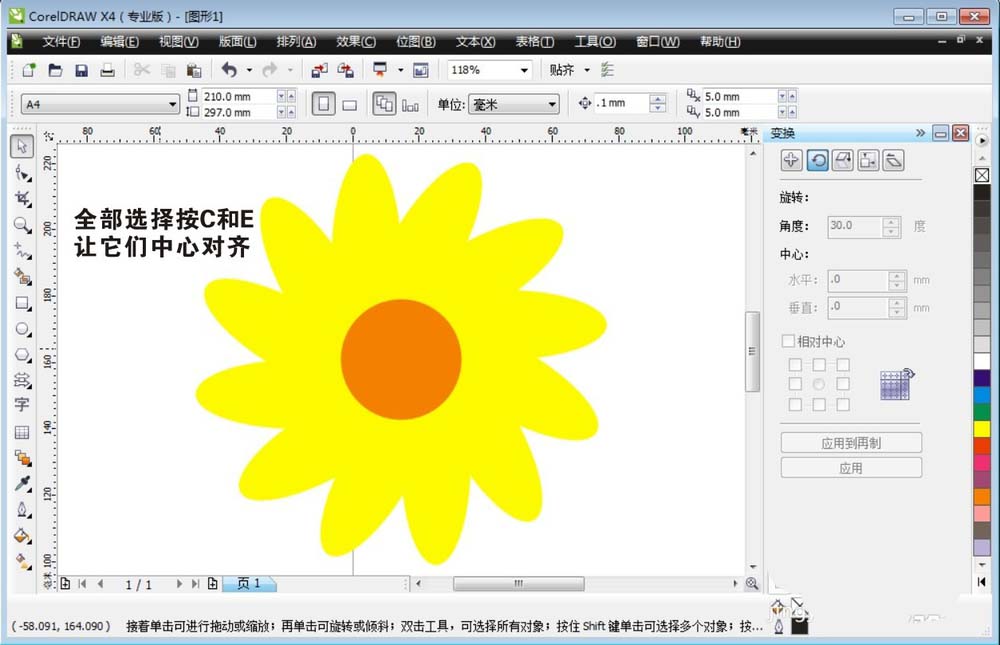 6、然后在同時選擇正圓和花朵的邊緣,按住C和E兩個快捷鍵把它們中心對齊,就是一個美麗的花朵形狀了。