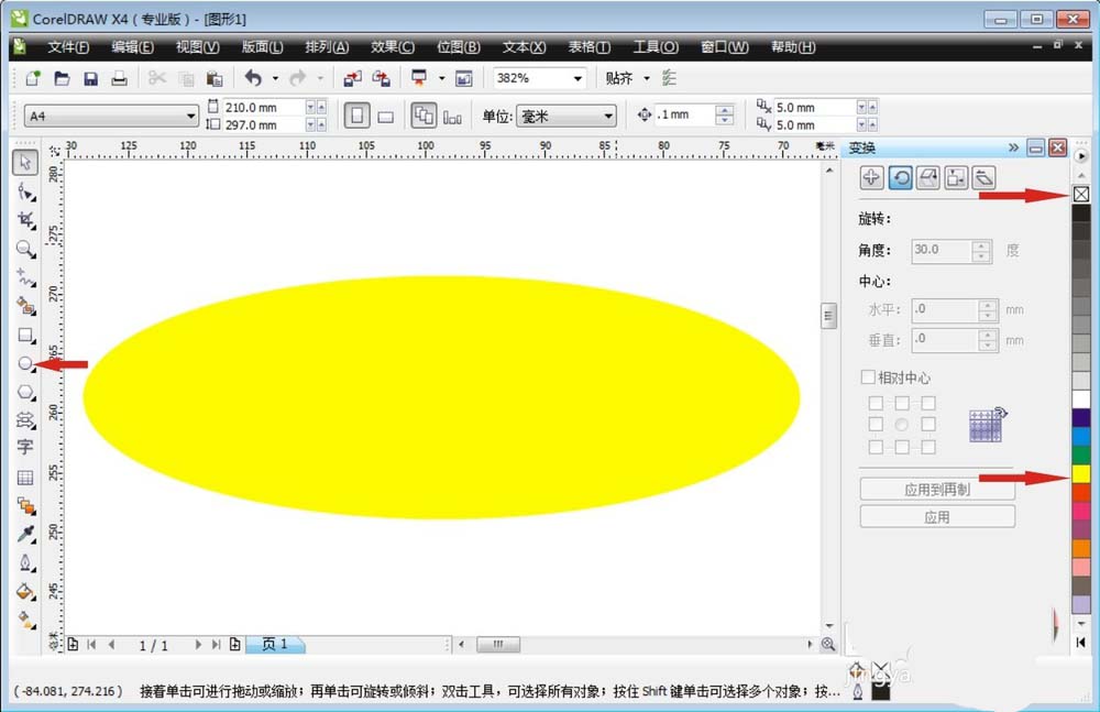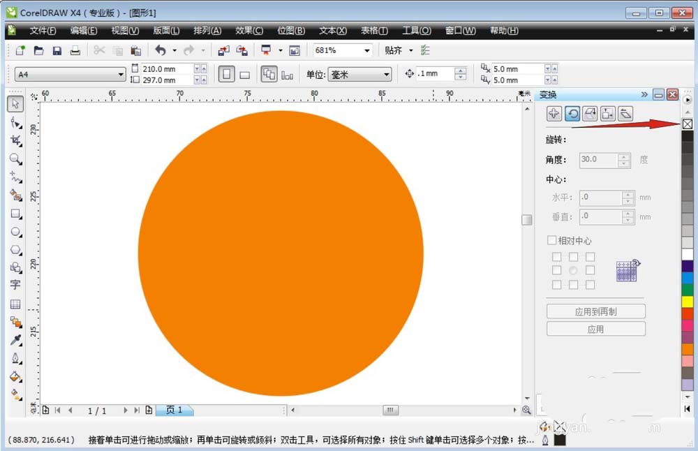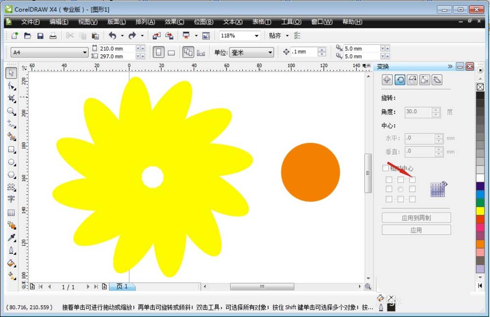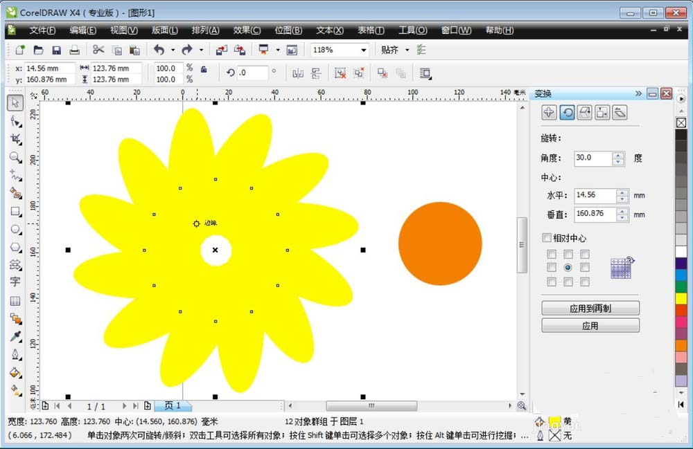 4、然后點擊旋轉功能,在點擊右上角為中心點,選轉角度為30度,旋轉長圓形直至為一個花朵的邊緣形狀。