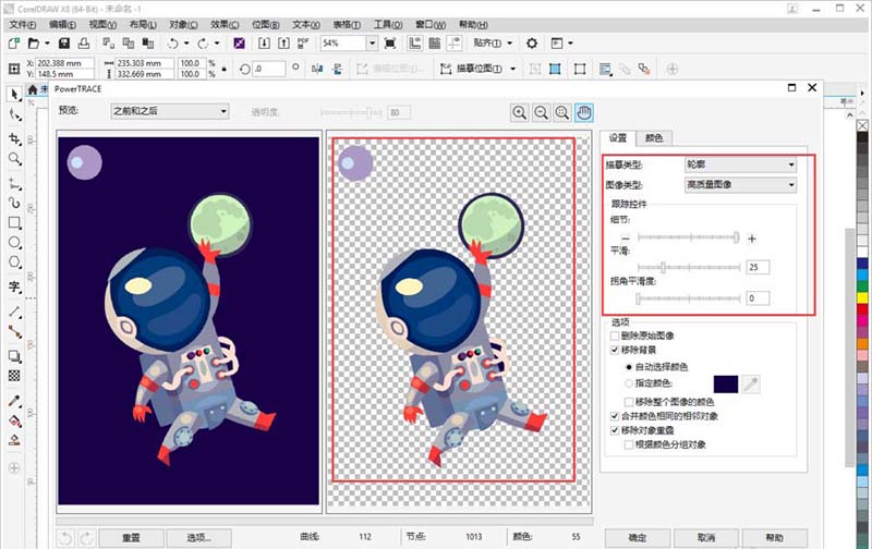 2、在彈窗中可以看到,軟件已經默認為你對圖片進行了矢量圖處理,通過右側的【細節】【平滑】【拐角平滑度】,來調整細節部分,在左側可以看到調整好的預覽效果。