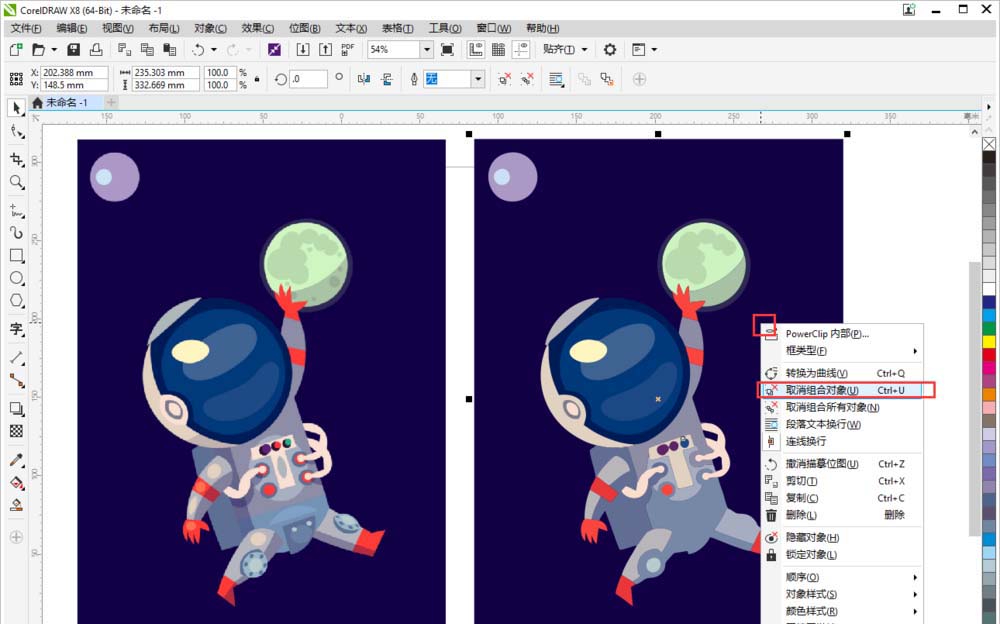 2、點擊右側轉換好的矢量圖,鼠標右鍵,取消組合對象。所有的小元素就都可以拆開拿出來啦~